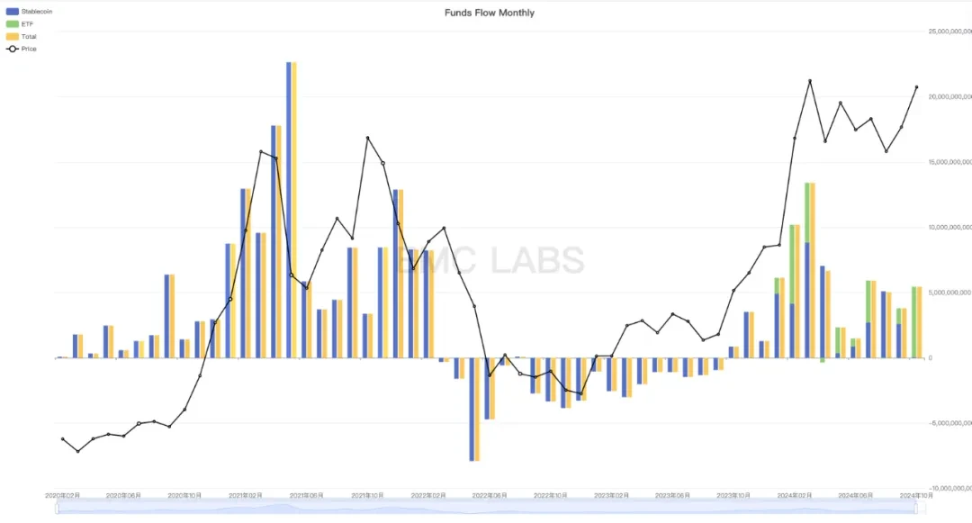 加密资产市场资金流入流出月度统计(Stablecoins+BTC ETF)