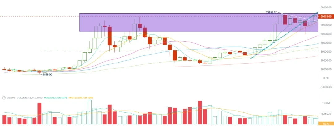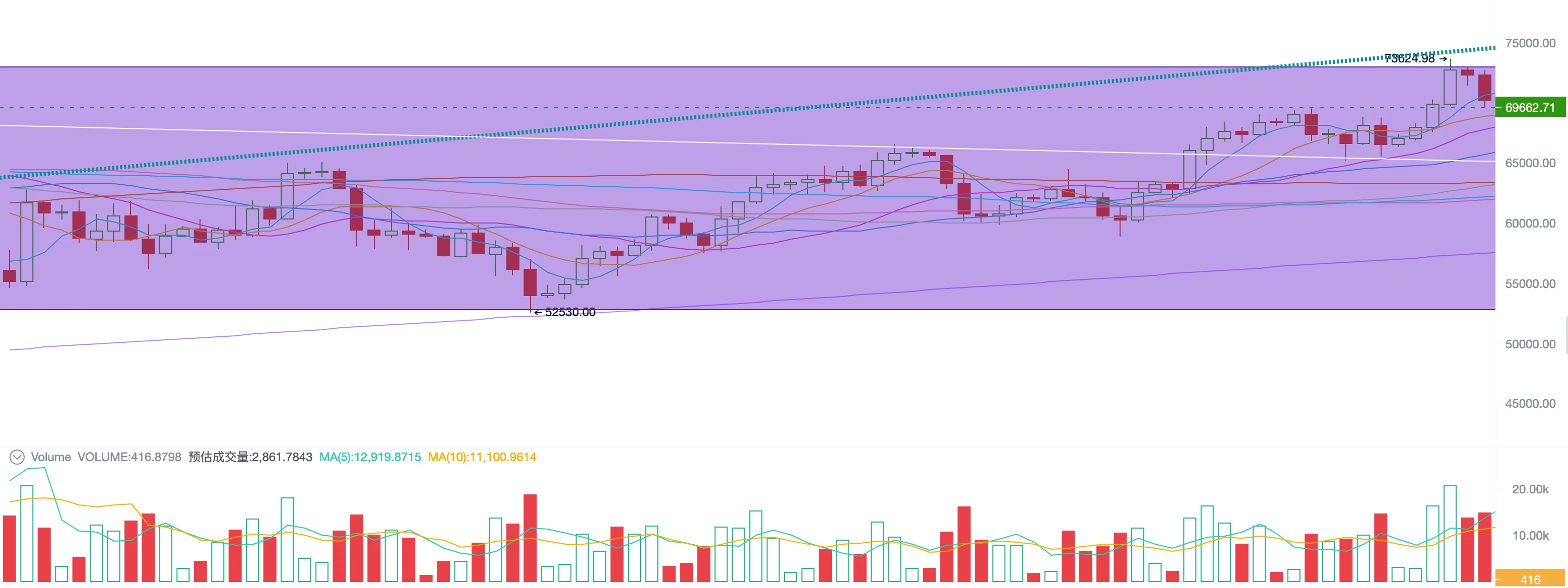 当前,市场行情处于试探上穿“新高整理区”上沿后的回踩阶段。接下来,我们重点关注两个技术指标,其一为“新高整理区”上沿(73000 美元)和上升趋势线(目前大约在 75000 美元)。此前报告中我们强调,对“新高整理区”的有效突破意味着长达 8 个月的漫长整理的结束,而重新踏上上升趋势线,则意味着新行情(牛市第二波亦即主升浪)的到来。