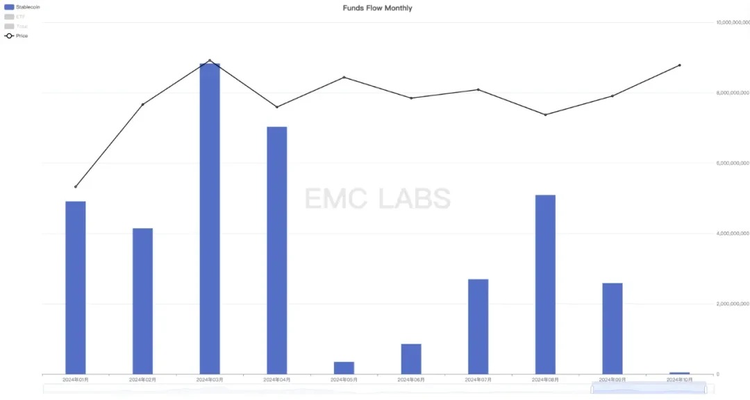 而稳定币通道资金在 10 月表现非常疲软,全月仅取得 0.47 亿美元的流入,录得今年以来最差单月表现。