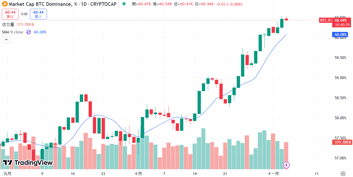 值得一提的是,据 TradingView 数据 显示,比特币市占比(BTC. D)目前已经达到 60%,创下了自 2021 年以来的历史新高。