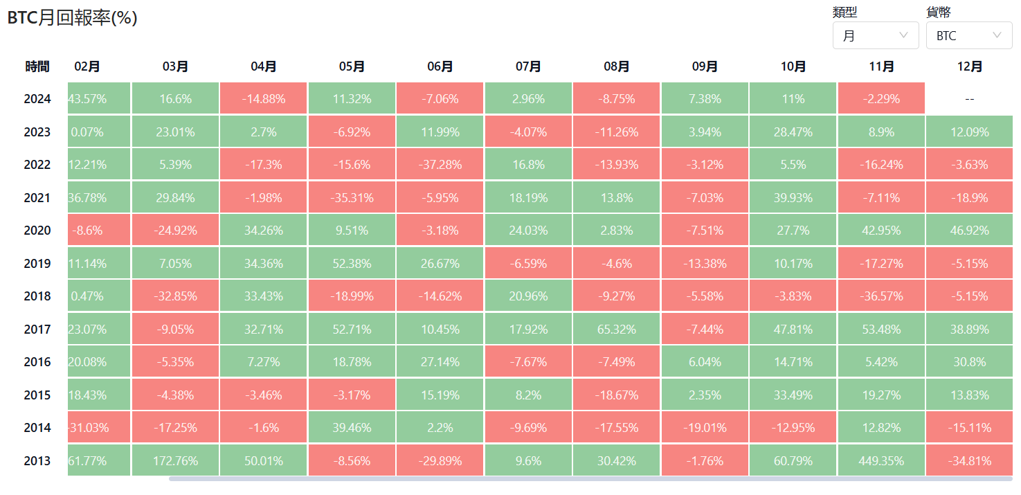 据 Coinank 数据 显示,在过去的十年裡,比特币在两个大选年的 11 月和 12 月表现为: