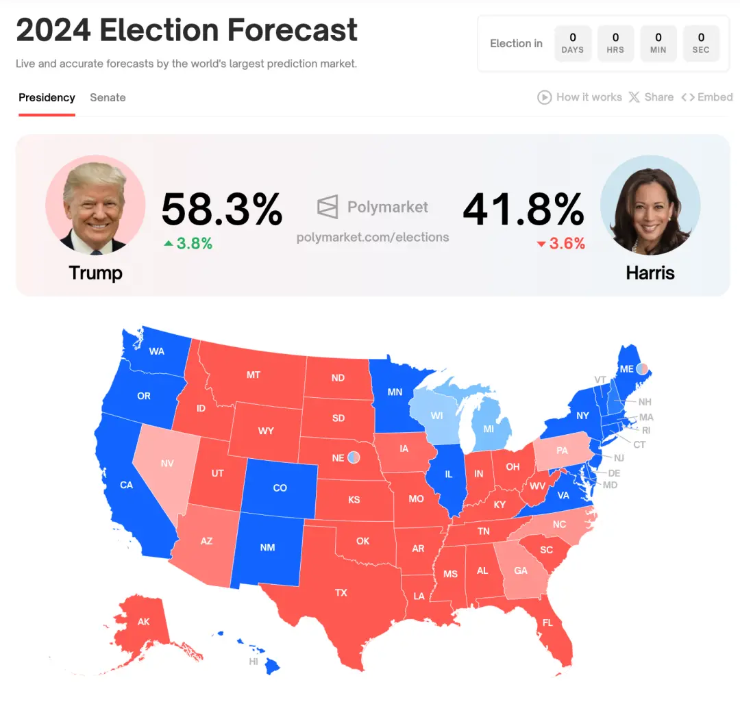 2024 年 7 月: 特朗普意外遇刺大难不死,民意支持率大幅上涨,被认为是“天选之子”。拜登宣布退出竞选,副总统哈里斯接棒参选。