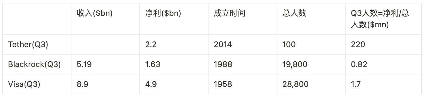 Tether 最新发布的Q3数据展现了它超强的盈利能力。截至 Q3,其资产总额达到 $125bn ,其中美债约 $102bn ,Q3净利 $2bn ,全年累计利润 $7.7bn 。相较之下,BlackRock Q3 利润为 $1.6bn ,Visa 为 $4.9bn ,而 Tether 的人数不到他们的百分之一,人效是他们的百倍以上。