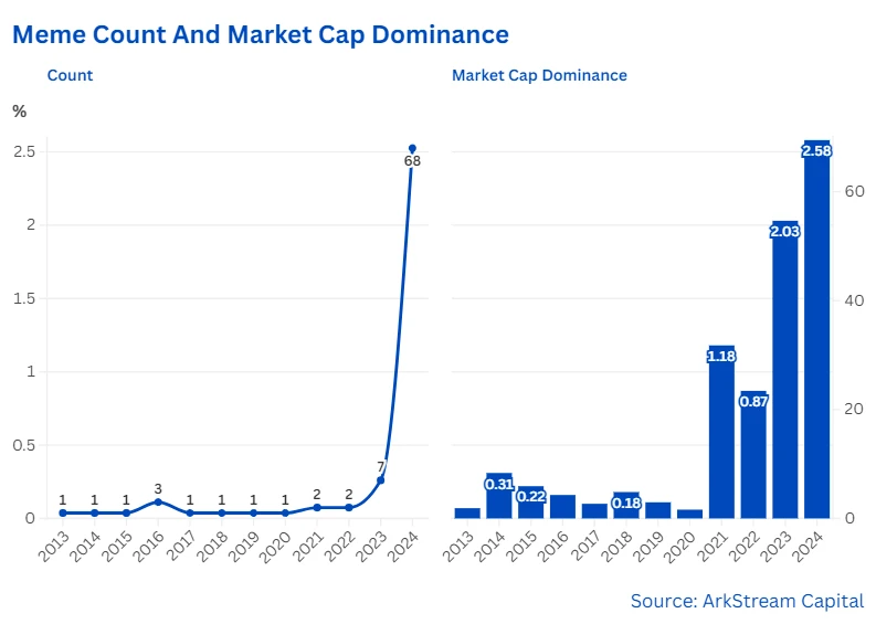 在这段时间里,Meme 的市值不仅实现了显著的增长,而且其种类和数量也得到了增加。截止 2024 年第三季度末,Meme 在整个加密市场中的市值占比,已经从两年前的 0.87% ,达到如今的 2.58% ,且仍有不断增长的趋势。如果做一个简单的线性回归模拟,