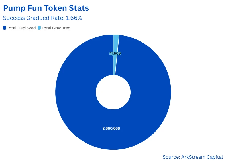 Meme 市场中不断有新币种涌现,它们的涨幅有时甚至超过了 BTC 等主流加密货币。这表明 Meme 代币领域具有较高的波动性和投机机会。然而,在众多新 Meme 中,以 Pump fun 数据为例,成功发射的 Memes 仅有不到 2% ,当前市值维持在 1 M 之上的仅有 0.23% ,也就是说能够经受时间考验并存活下来的概率极为渺小。