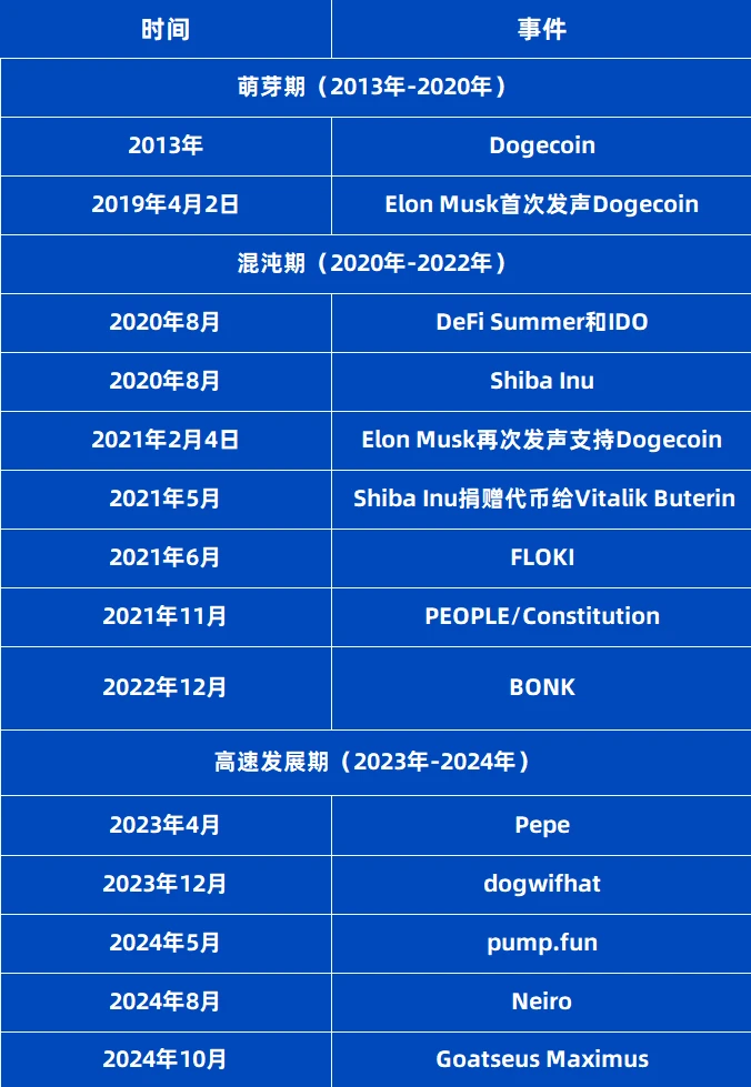 1、Meme 经历了 2013 年至 2019 年的缓慢萌芽阶段,随后 2020 年至 2022 年快速变化的混沌时期,终于在 2023 年至 2024 年迎来飞速的发展时期,并正式作为单一赛道获得了广泛的认可和受众基础。