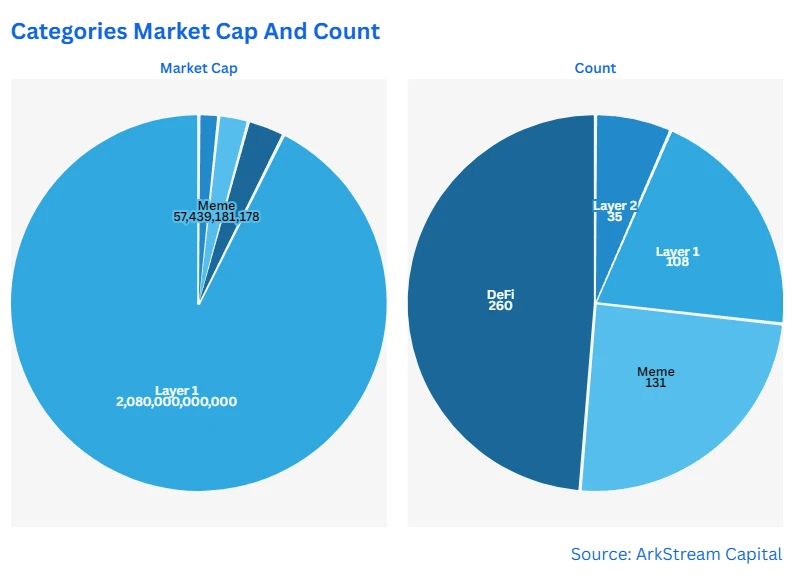 Meme 的市值和流通数量的变化可以反映市场对其的需求和接受程度。尽管部分 Meme 代币虽然市值不高,但新增 Meme 数量表明了社区对整个板块的兴趣在增长。相比于其他板块(Layer 1/Layer 2/DeFi),Meme 在近两年的板块总市值、新增数量等方面都是远远领先。
