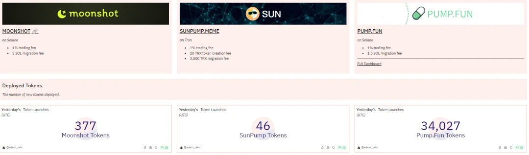 在发射机制方面,Moonshot 相较于 pump.fun 的主要改进在于支持不同外部 DEX 的初始池子添加,以及在初始打满市值时有所差异。除此之外,两者在其他方面的区别并不显著。至于 Sunpump,其整体机制与 pump.fun 相似。 由于行业普遍遵循“first is first”原则,即便通过代币空投等激励手段吸引用户进行吸血鬼攻击,新进入者也很难实现大幅度超越。接 下来,我们结合 dune 的数据来深入了解 pump.fun、Moonshot 和 Sunpump 的数据表现,以评估它们在市场中的表现和竞争力。