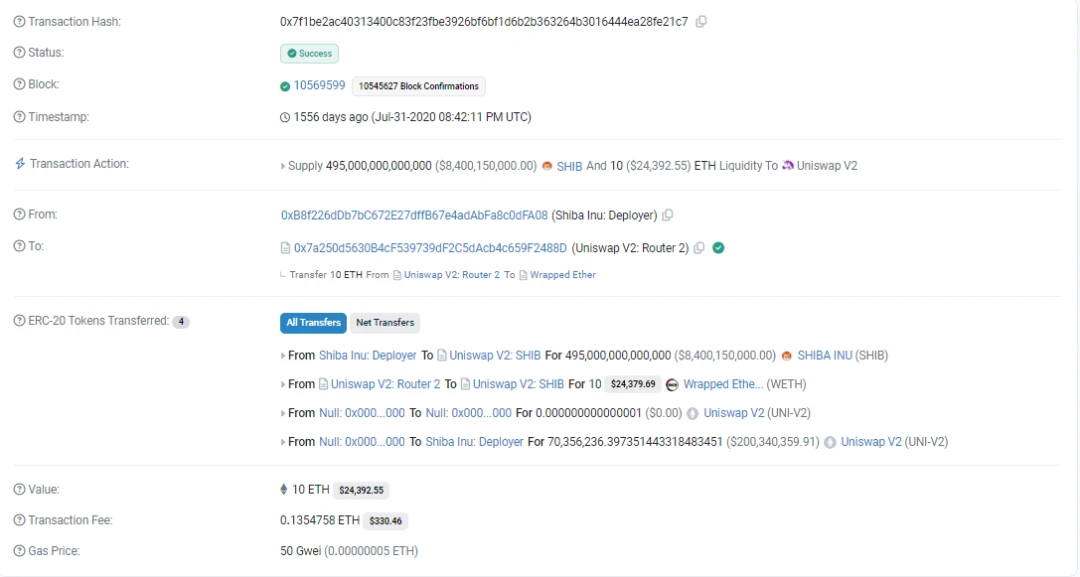 即使过去了几年,依然能够查看到最初的流动性建立。以 SHIB 为例,我们能够通过查看 SHIB 添加流动性池的初始交易,得以知道其市值的惊人增长。最初,SHIB 的市值仅相当于 20 个 ETH,当时的价值大约为 10 K 美元,折算如今的 ETH 市价,SHIB 的初始市值也仅仅是 50 K 美元。这对于一年之内市值增长至十亿级别的 Meme 来说,其财富增长效应无疑是极具吸引力和宣传价值的。