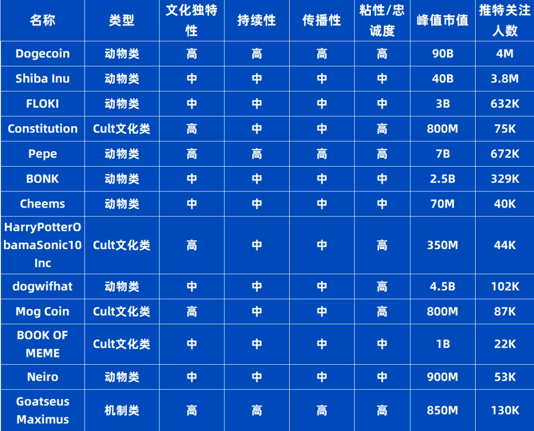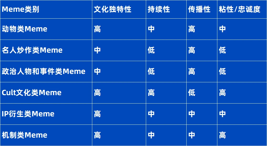 Meme 在不同类别中展现出独特的文化特色和受众基础,这影响了它们的持续性、传播性和对社区的粘性。 在这些类别中,动物类 Meme 和 Cult 文化类 Meme 因其深厚的文化根基和忠实的粉丝群体,我们认为是适合长期关注的类型。相比之下,其他类别的 Meme 往往与短期热点相关,它们的关注度和流行度可能会迅速上升然后回落。 为了快速识别并理解各种 Meme 的核心特征,我们提供了以下评估框架。