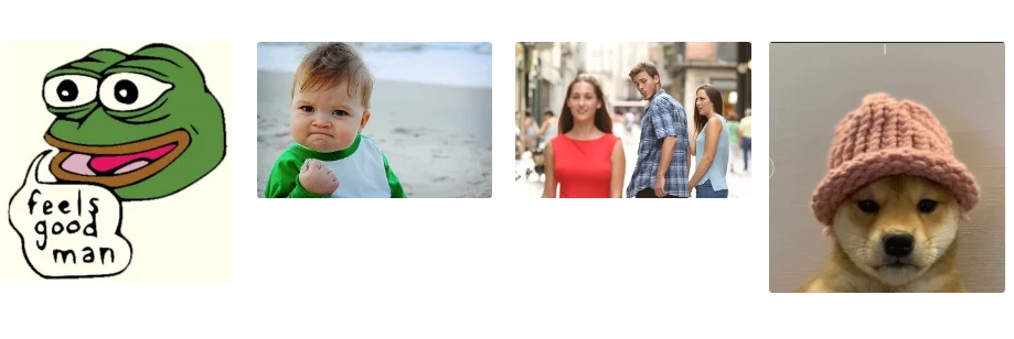 1、动物类 Meme: 以动物形象为基础,通过幽默文字表达情感或观点,因可爱和亲和力而受到广泛喜爱。最知名的无疑是狗狗的 Dogecoin、青蛙的 Pepe 等。