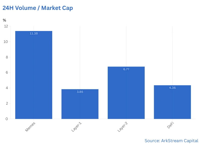 2、Meme 的日均换手率大约为 11% ,相比之下,DeFi 为 5% ,Layer 2 为 7% ,Layer 1 的日均换手率是 4% ,这一比例不仅凸显了 Meme 的高流动性,也表明用户对 Meme 的兴趣和交易频率较高。