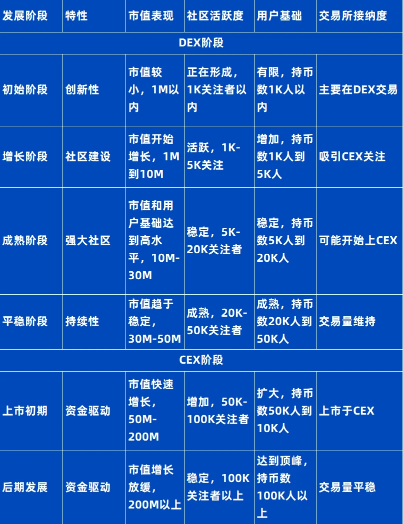 Meme 的生命周期具有不可预测性,其存活时间可能短至几分钟,也可能长至数年。 对于能够经受时间考验并持续流行的 Meme,它们通常会经历几个不同的发展阶段。 我们以 DEX 和 CEX 为界,概述了 Meme 从 DEX 的早期阶段到 CEX 的成熟阶段的基本演进过程。在这一过程中,Meme 的市值和社区规模等关键指标会表现出显著的变化。