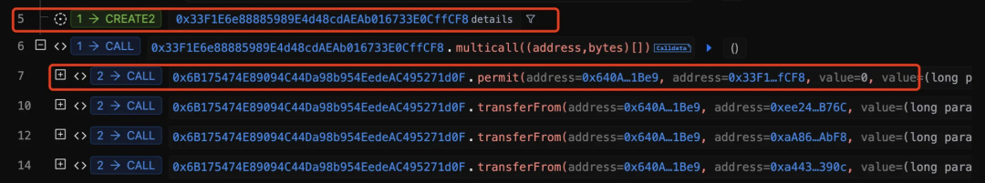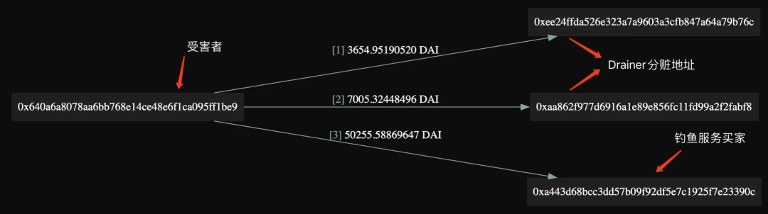 2. 调用创建的合约,将受害人的DAI批准给钓鱼地址(Inferno Drainer服务的买家)和分赃地址。攻击者通过前文提到的各种钓鱼手段,引导受害者无意中签署了恶意的Permit2消息。Permit2允许用户通过签名授权代币的转移,而不需要直接与钱包进行互动。于是,受害者误以为他们只是在参与常规交易或授权某些无害的操作,实际上却在不知不觉中将自己的DAI代币授权给了攻击者控制的地址。