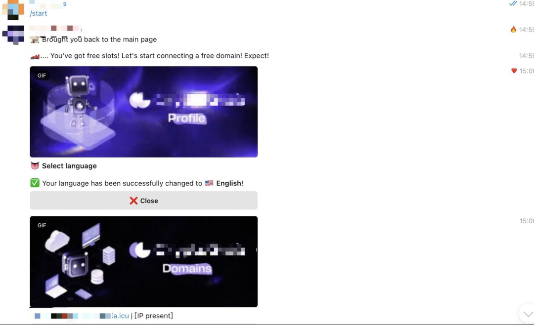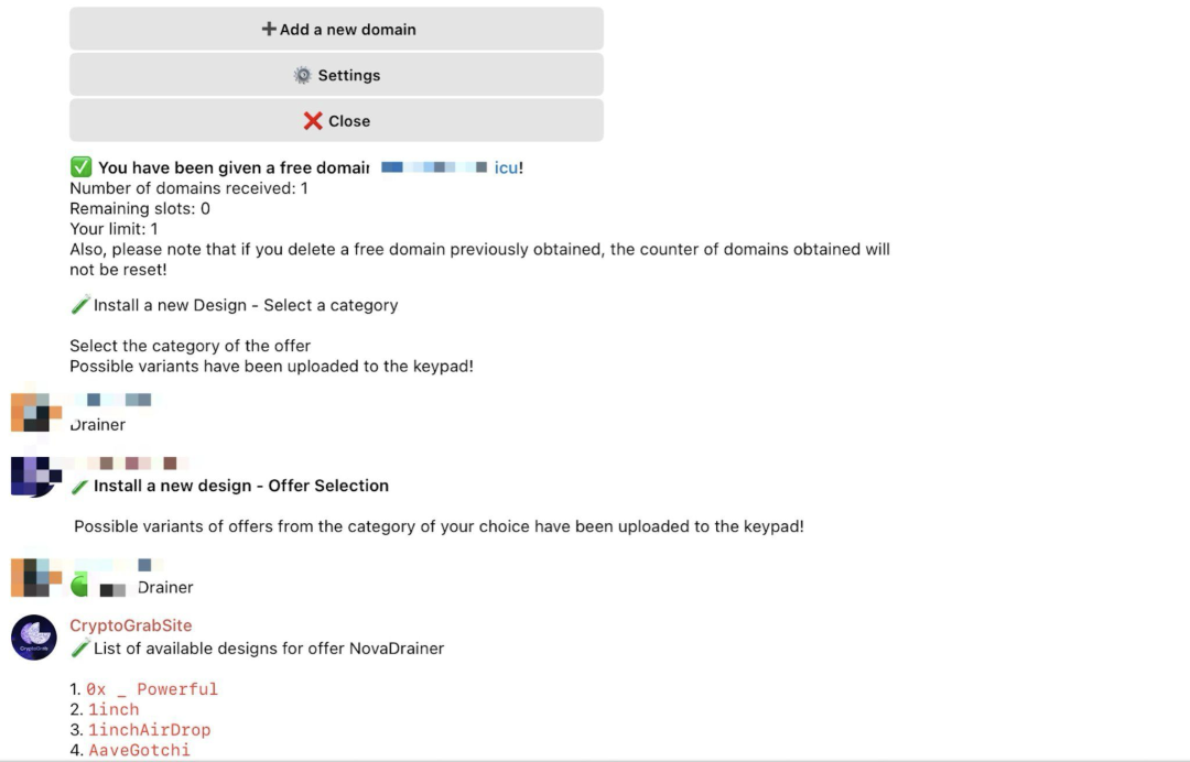 第一步 ,进入Drainer提供的TG频道后,只需一个简单的命令,一个免费域名和对应的IP地址就被创建了出来。