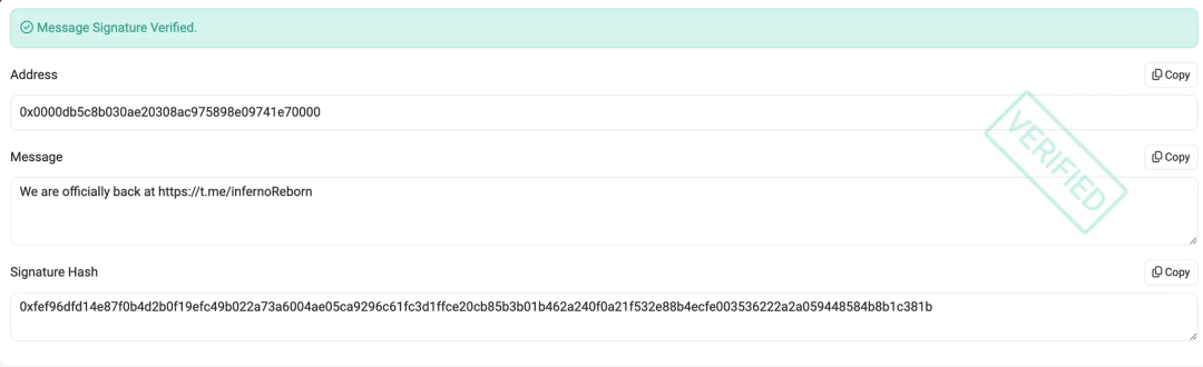 2024年5月21日,Inferno Drainer在etherscan上公开了一条签名验证消息,宣告回归,并创建了新的Discord频道。