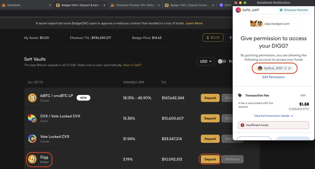 1. 伪造知名项目前端: 攻击者通过精心模仿知名项目的官方网站,创建看似合法的前端界面,让用户误以为自己正在与可信任的项目进行交互,从而放松警惕,连接钱包并执行不安全操作。如图1中,钓鱼团伙将自己的页面伪造成bagerDAO的前端页面,用户一旦在页面上批准交易,其代币就会被授权给攻击者的地址。