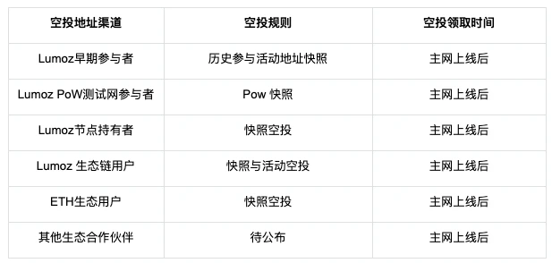 4、Lumoz 生态链用户: 包括 Merlin Chain, ZKFair, Ultiverse, Matr1x 等使用 Lumoz RaaS 服务的优质生态链。 该部分空投将由两部分组成: