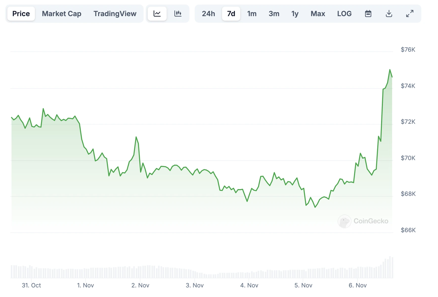 其实,从特朗普拿下关键摇摆州的那一刻起,他成为美国总统就已经大局已定。然而,从 11 月 5 日开始计票,到特朗普展现出明显优势,再到摇摆州的选票统计结果放出,中间相距数个小时,这段时间比特币走势可谓疯狂:在北京时间 5 日晚,也就是美国当地时间 11 月 5 日投票站开放的时间,比特币价格尚在 68000 美元左右波动; 在北京时间 11 月 6 日早晨就一路高歌冲破 7 万美元大关,中午直接冲破 75000 美元达成新高成就,之后在 74000 美元以上波动。