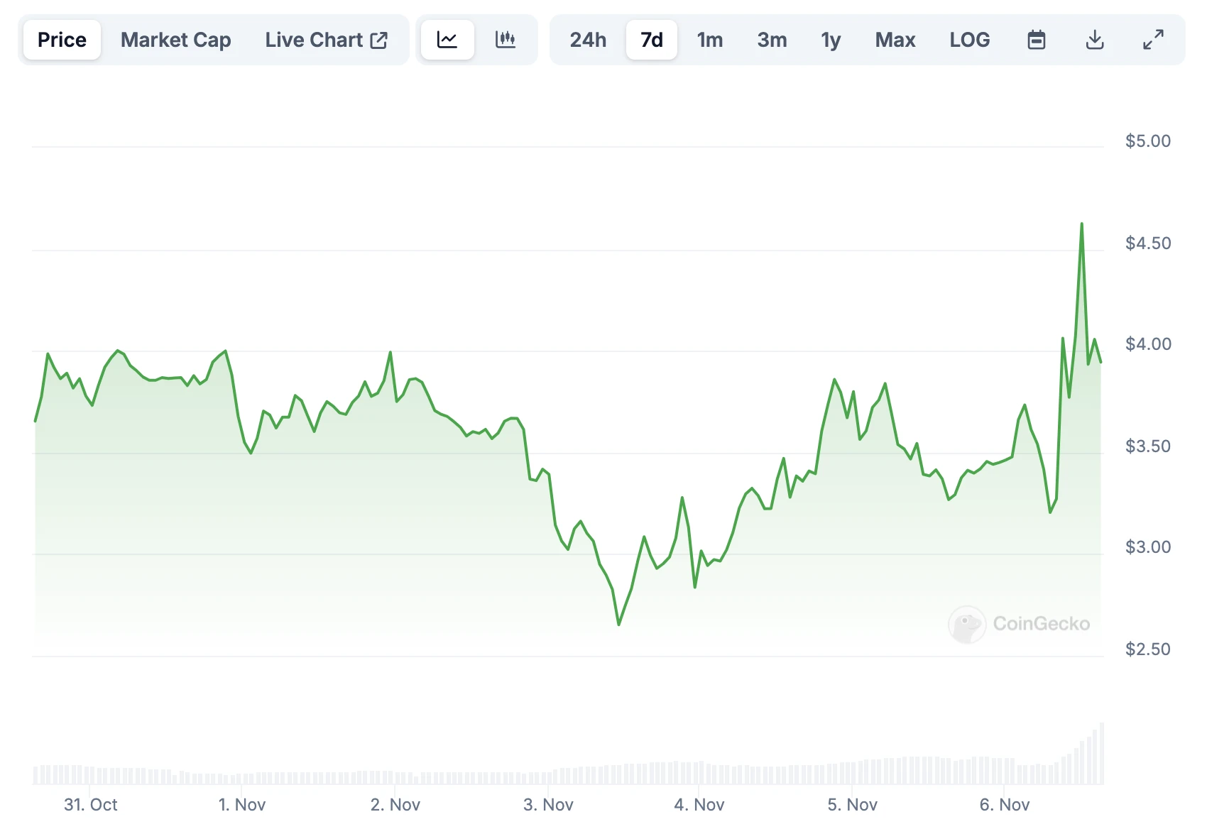MAGA 代币 24 小时涨幅达到 20% ,现报 3.95 美元,预期中的大地址抛售并未出现,而是出现了大幅上涨;