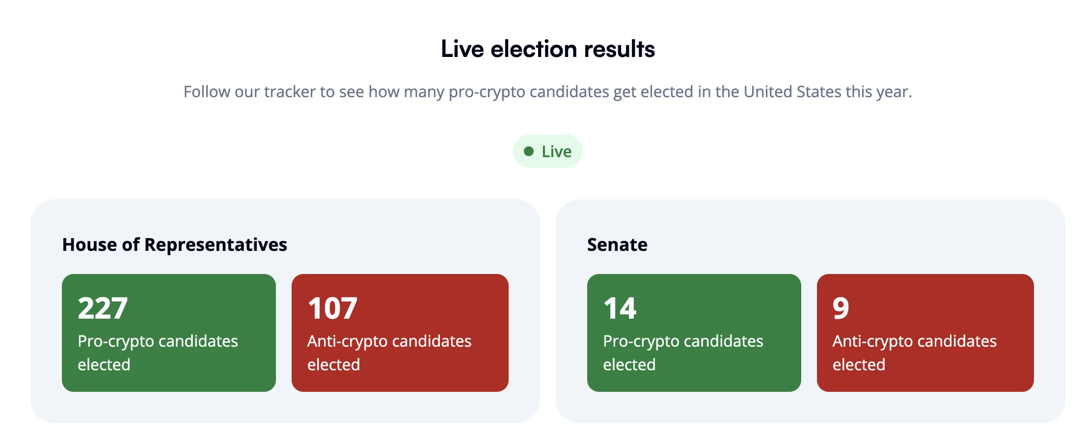 据 StandWithCrypto 官网 显示, 截至撰稿时,目前当选的参议员和众议员中,支持加密货币的候选人数量分别为 14 人和 227 人,远超反对派人士数量。