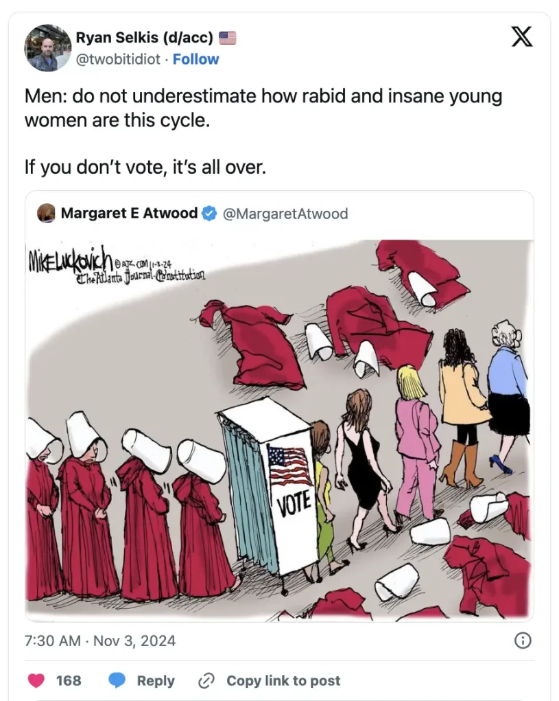 这些竞选团体并不总是明确表示他们的偏好。但他们的盟友会,而且效果往往是排斥性的。比如,这里是曾经的梅萨里人瑞安·塞尔基斯在讨论他对当今自由派白人女性的感受。