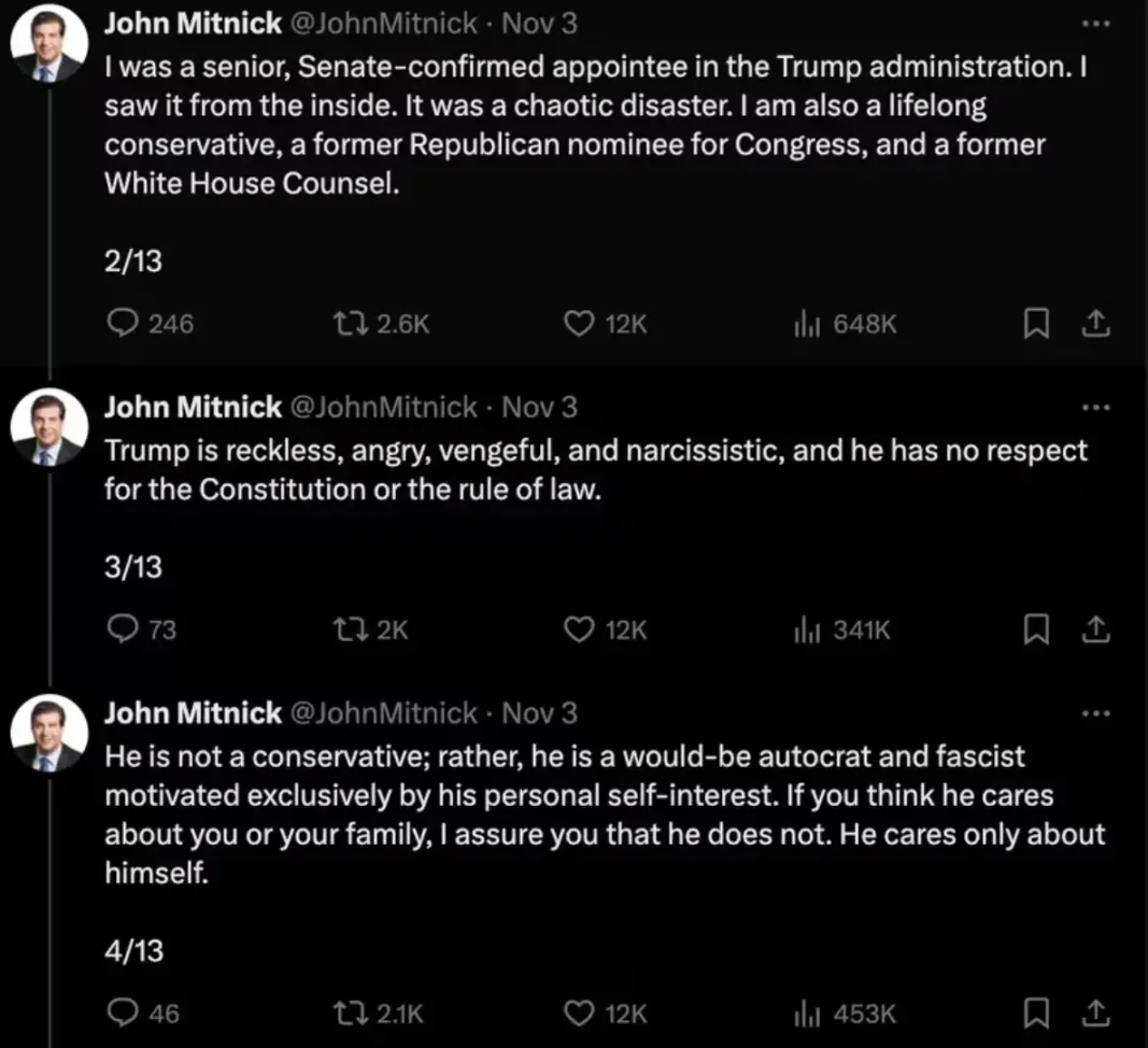 John Mitnick 表示:特朗普鲁莽、易怒、报复心强、自恋,不尊重宪法和法治;特朗普并非保守派,他更像一个由个人利益驱动的独裁者和法西斯主义者。他才不会像他说的那样关心你和你的家人,他只关心自己。