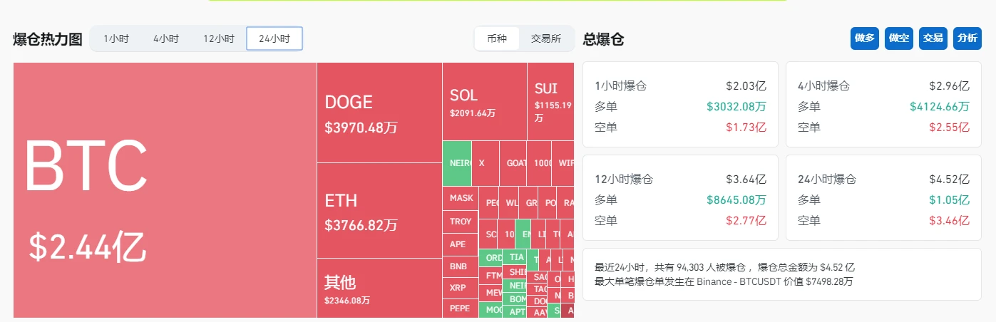 衍生品交易方面,Coinglass 数据显示,过去 24 小时全网爆仓 4.52 亿美元,其中绝大部分为空单爆仓,数额达 3.46 亿美元。从币种来看,其中 BTC 爆仓 2.44 亿美元,DOGE 爆仓 3970 万美元,ETH 爆仓 3766 万美元。