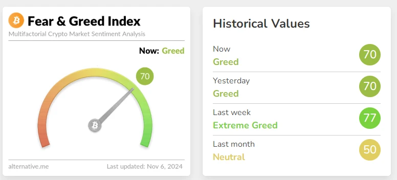 Alternative 数据显示, 今日恐慌与贪婪指数升为 70 ,等级仍为贪婪 ,而上一周的等级为极度贪婪。