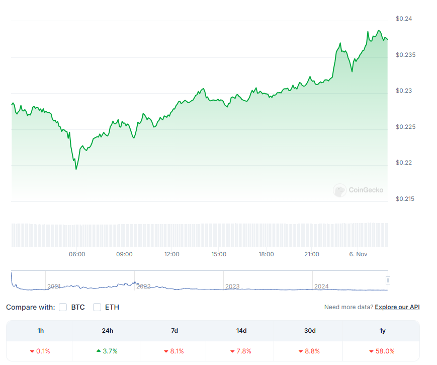 据 CoinGecko 数据 ,Curve 代币 CRV 今年表现并不算好,在近 1 年的时间裡暴跌了 58%,撰稿时报 0.2375 美元,近 24 小时上涨了 3.7%。