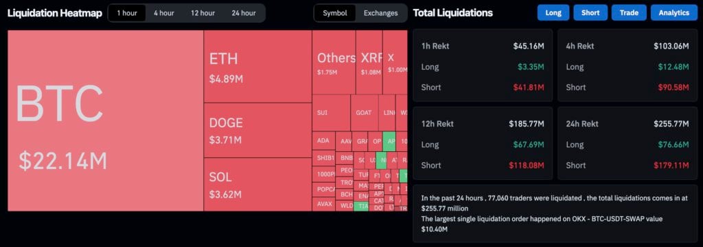 比特币震盪下跌的行情中,据 Coinglass 数据 显示,过去 24 小时,加密货币全网爆仓金额超过 2.5 亿美元(空头占 1.79 亿美元),有超 7.7 万人遭清算。目前比特币波动明显放大,请投资者小心谨慎。