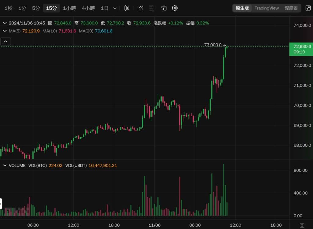 快讯》比特币「叩关7.3万」距新高仅不到700美元,川普领先送大礼?