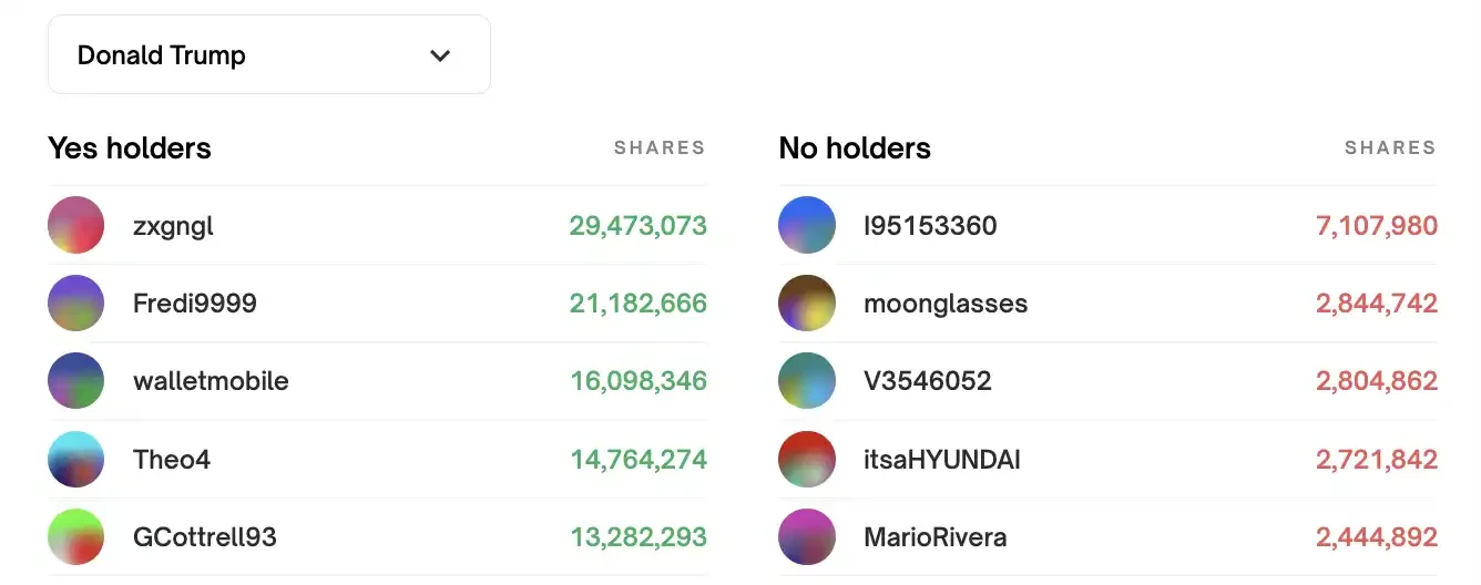 下图展示了在 Polymarket 上用户对特朗普是否当选总统的投注份额分布。左侧的「支持者」表示认为特朗普会当选的用户,其中最大持有者「zxgngl」持有 29, 473, 073 份股份,目前总盈利达 1131.5 万美元。其他主要支持者包括前文提到的「Fredi 9999 」和「walletmobile」。