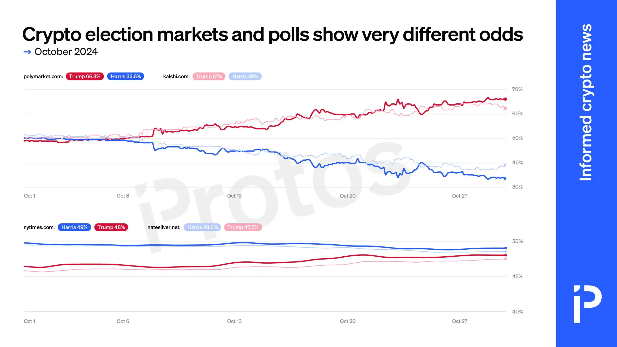 据 Protos 数据,Polymarket 和 Kalshi 与《纽约时报》(NYT) 和 Nate Silver 的选举赔率进行了并列比较,它们的差异是显而易见的,比如在 10 月 31 日,Polymarket 上特朗普在美国大选中获胜的几率为 66% ,但在 The Hill 上只有 48% 。