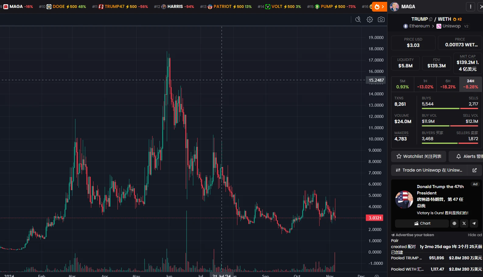 而创建较长时间的特朗普系 MEME 则没能迎来预期的上涨,$tremp 2 天上涨了约 30% ,$DMAGA(Dark MAGA)则经历了过山车,上午上涨了约 110% ,但截至 11 月 6 日下午 5 点又下跌了 70% 左右,价格基本回到未上涨前的水平。MAGA 的剧本也如出一辙,同样是拉升了 44% 后跌回原位,从长周期来看,MAGA 距离历史高点 17 美元还是跌去了 82% 的市值,预计需要再拉升 5 倍以上才能回到前高。而这一切都没能在特朗普赢得大选时发生。