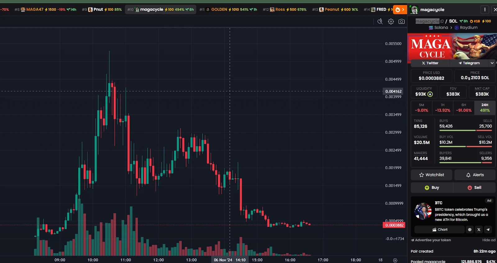 除了交易量的热度之外,在市场表现上多数的特朗普相关代币也没有实现大众期待的一飞冲天行情。多数新创建的代币在 11 月 6 日中午之前表现强劲,而随着大选结果确定性逐渐趋稳,这些代币开始急剧下跌,不少热门的币种都下跌了 90% 以上,以名为 magacycle 的代币为例,这个代币在 11 月 6 日早上创建,直至 10 点 30 分左右都处于快速拉升的状态,而从 10 点 30 分开始,这个代币的价格开始快速下跌,截至 11 月 6 日下午 4 点,距离高点已跌去 91% 。其他的代币如$EAGLE、$BSDNT 等新创建的代币也都下跌了 90% 以上。