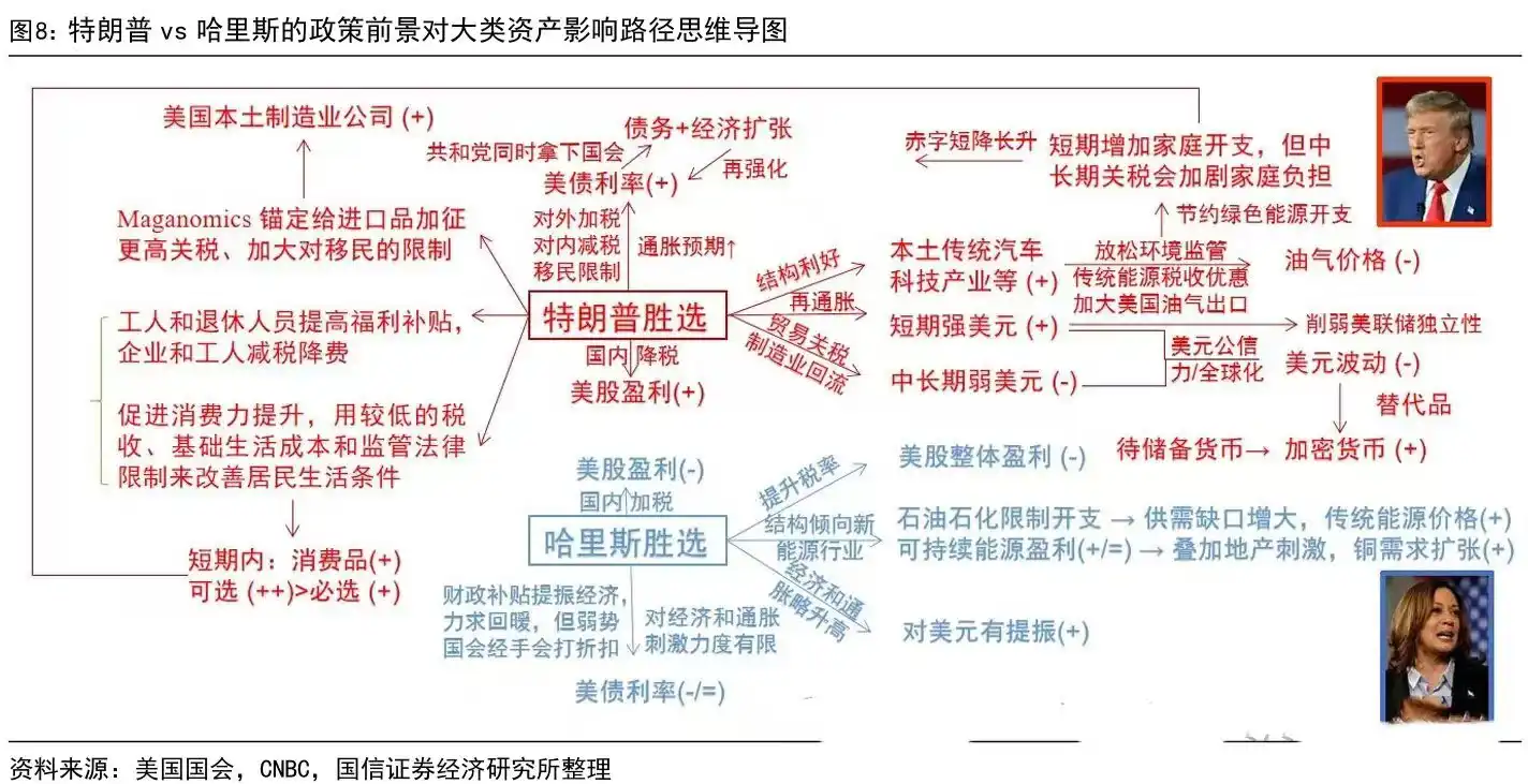 市场普遍认为,特朗普胜选后的交易比较复杂。偏多的资产类别包括黄金和比特币等加密货币,美股和美元可能呈现短期上涨但中期回调的趋势。而原油、美债、铜等资产则可能受到一定程度的利空影响。