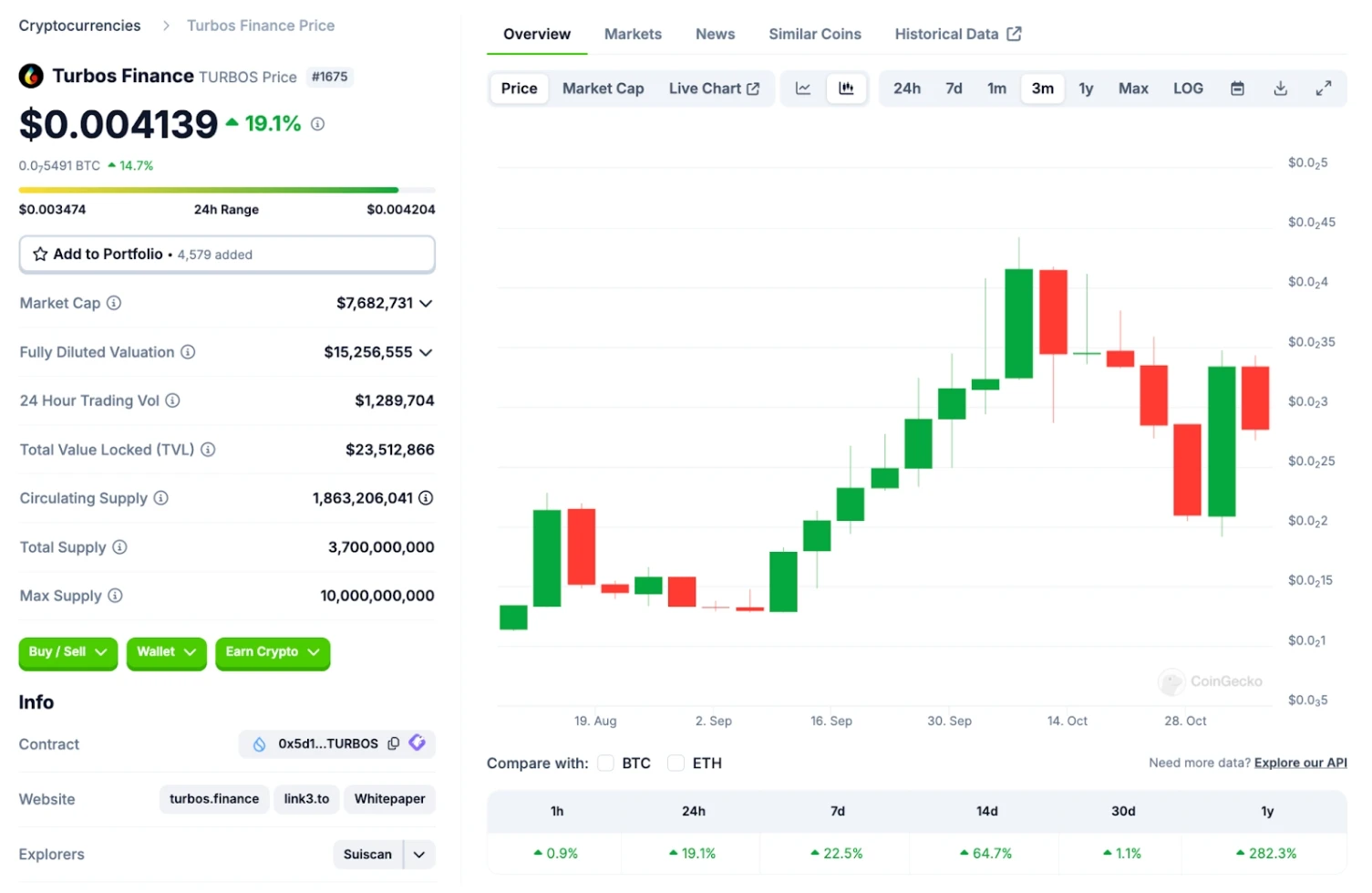 值得关注的是,Turbos 代币在过去 24 小时内涨幅超过 20% ,相比同期 SUI 的 7% ,涨幅高出两倍,反映了市场对 Turbos 生态的高度关注。