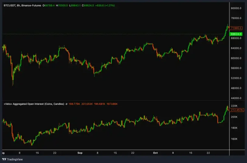 我们一直在追逐价格,未平仓合约(OI)不断增加,即便永续合约的领先幅度非常大,比特币仍然持续上涨,没有出现剧烈回拨,即使纳斯达克表现疲弱。比如在 10 月 17 日,67K 附近的价格保持平稳一段时间,随后现货市场稍微跟进,但没有大幅回拨。这表明,市场上不仅有短期的杠桿清算需求,实际的需求也在支撑上涨。这也暗示了这波上涨是由事件驱动的,投资者希望在此时进场。