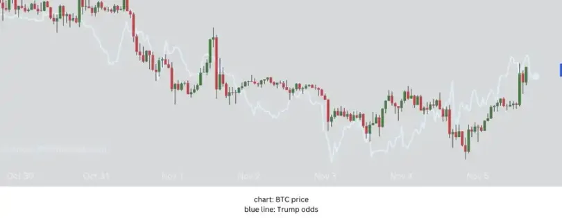 在连续上涨几天后,终于发生了转折。10 月 30 日 – 11 月 4 日:反转交易期间,比特币价格与川普胜选概率高度相关。自 10 月 10 日以来,市场第一次没有像以往那样轻鬆吸纳回拨,侭管价格创下新高,技术因素(如未平仓合约 OI 的改善)没有太大变化,但市场变得犹豫不决。