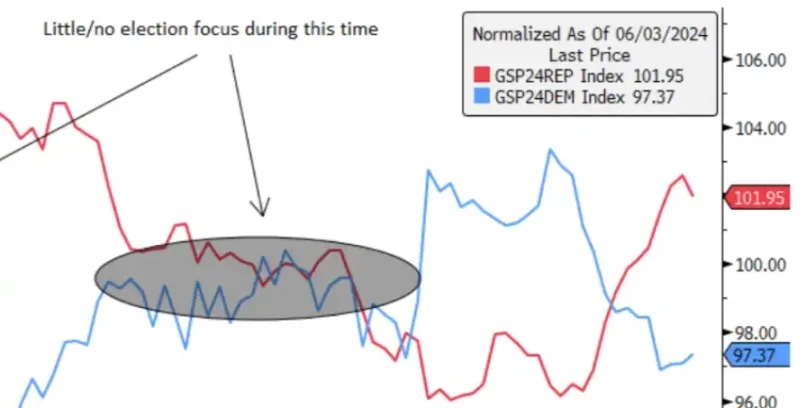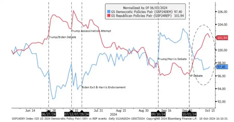 通过对比 GSP24DEM 和 GSP24REP 这两个篮子,可以清晰地看到在贺锦丽与川普辩论之后,市场对于贺锦丽获胜的信心一度显得过于自满。