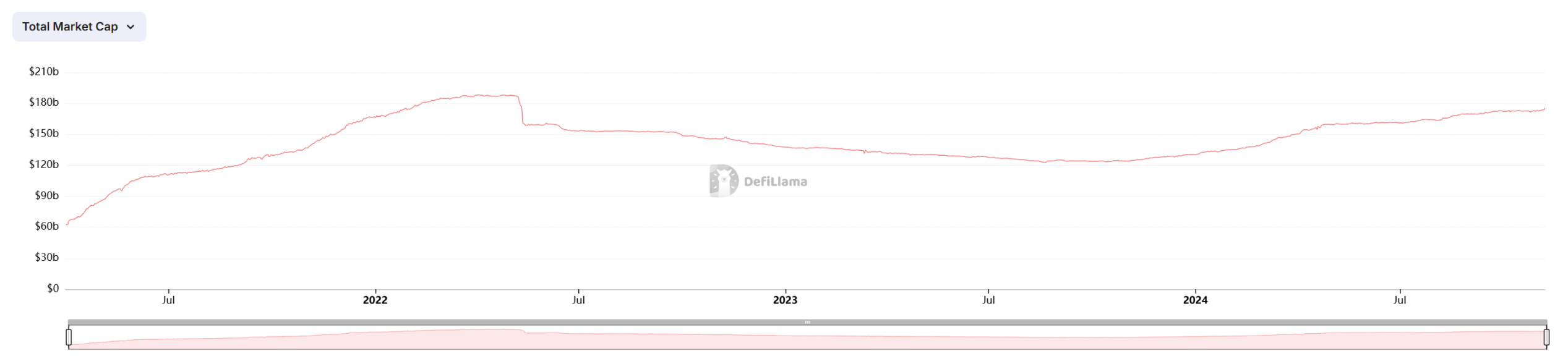 衡量市场资金的稳定币也表现不错。目前总市值已经升至 17506 亿美元上方,距离历史新高的 1870 亿美元已近在咫尺。过去 7 日,其市值增幅在 1.47% ,表明资金在不断流入。