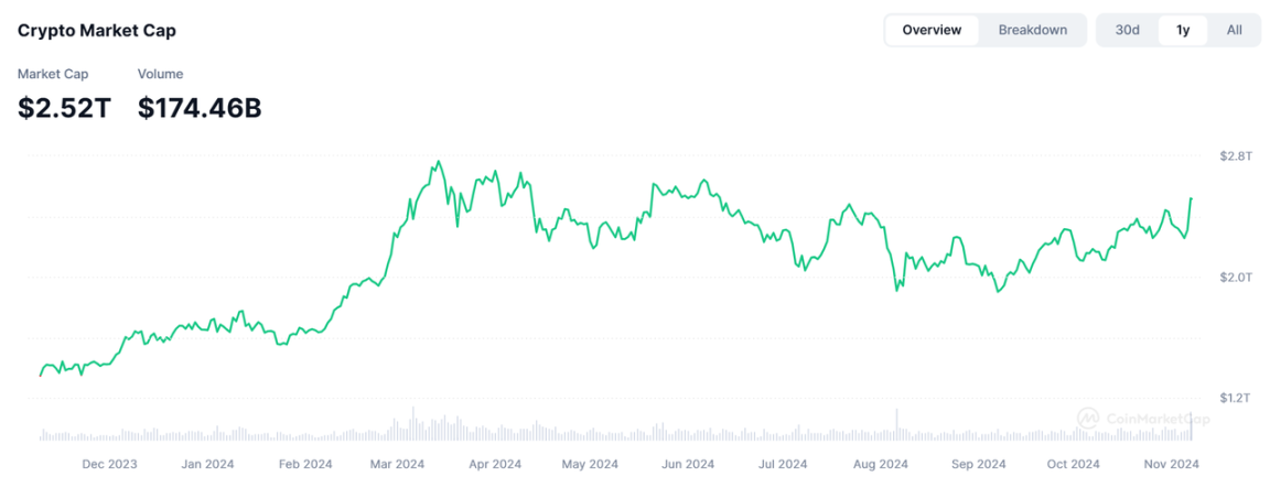 加密市场总市值升至 2.5 万亿美元,逼近历史新高