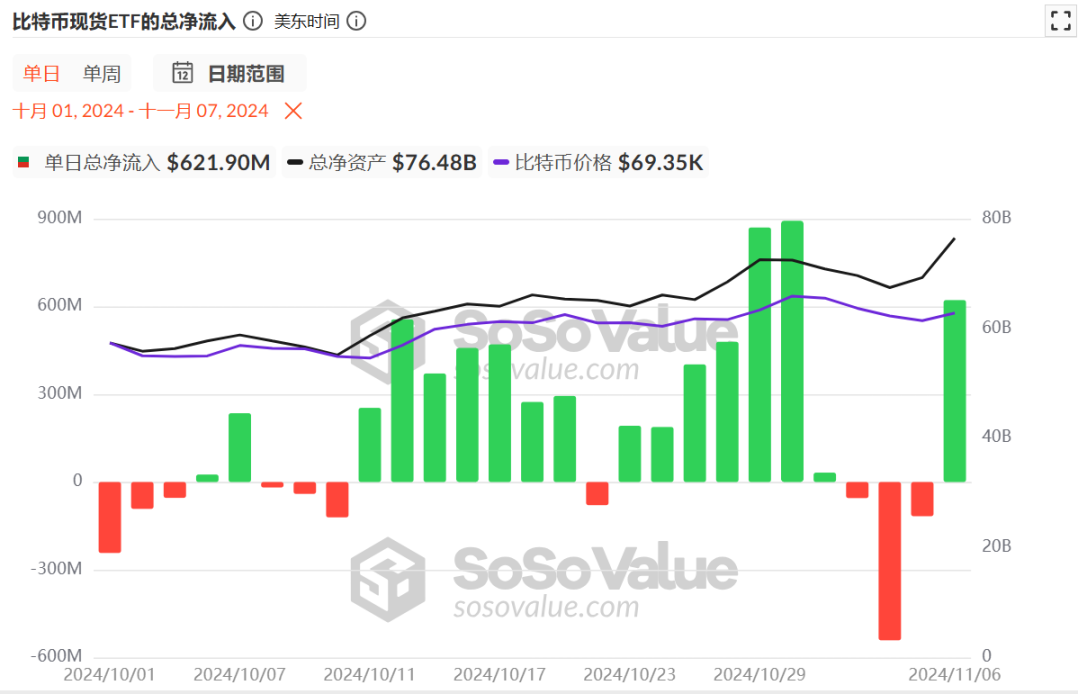 场外资金在大选结果确认之后,一改彷徨犹豫,再次涌入市场。目前,比特币现货 ETF 累计总净流入已升至 241.2 亿美元。