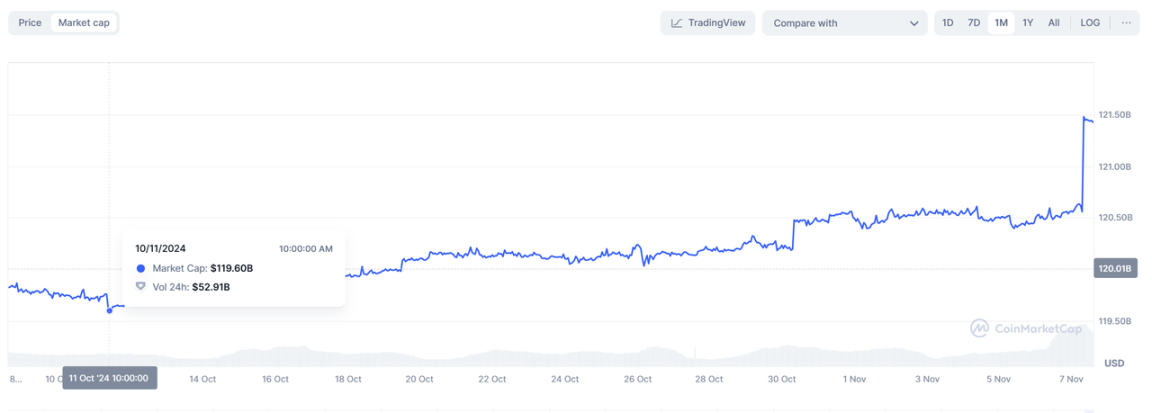 其中,USDT 过去一个从 1200 亿美元市值,升至 1215 亿美元市值。值得一提的是, 11 月 7 日,单日市值就从 1206 亿美元,飙涨至 1214 亿美元,增长超 8 亿美元。