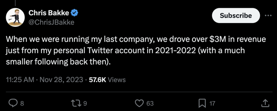在我们经营上一家公司的时候,仅通过我的个人 Twitter 账户,在 2021-2022 年间就创造了超过 300 万美元的收入(当时我的粉丝还少很多)。