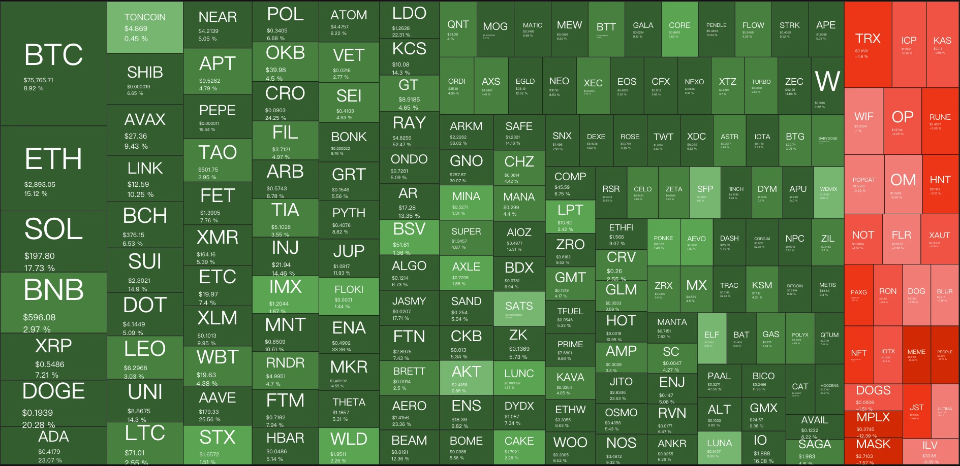 截止撰文,根据 CoinGecko 和 TradingView 数据,加密货币总市值为 2.672 万亿美元,比特币市占率为 59.86% 。虽然比特币市占率仍较高,但本月山寨币市场也正在回暖。根据 Quantify Crypto 数据,过去一周,在加密市值前 200 的币种中,除了 BTC 外,有 173 个代币实现上涨,其中 SOL 上涨超 17% , DOGE 上涨超 20% 、UNI 上涨超 14% 、LDO 上涨超 22% 等。
