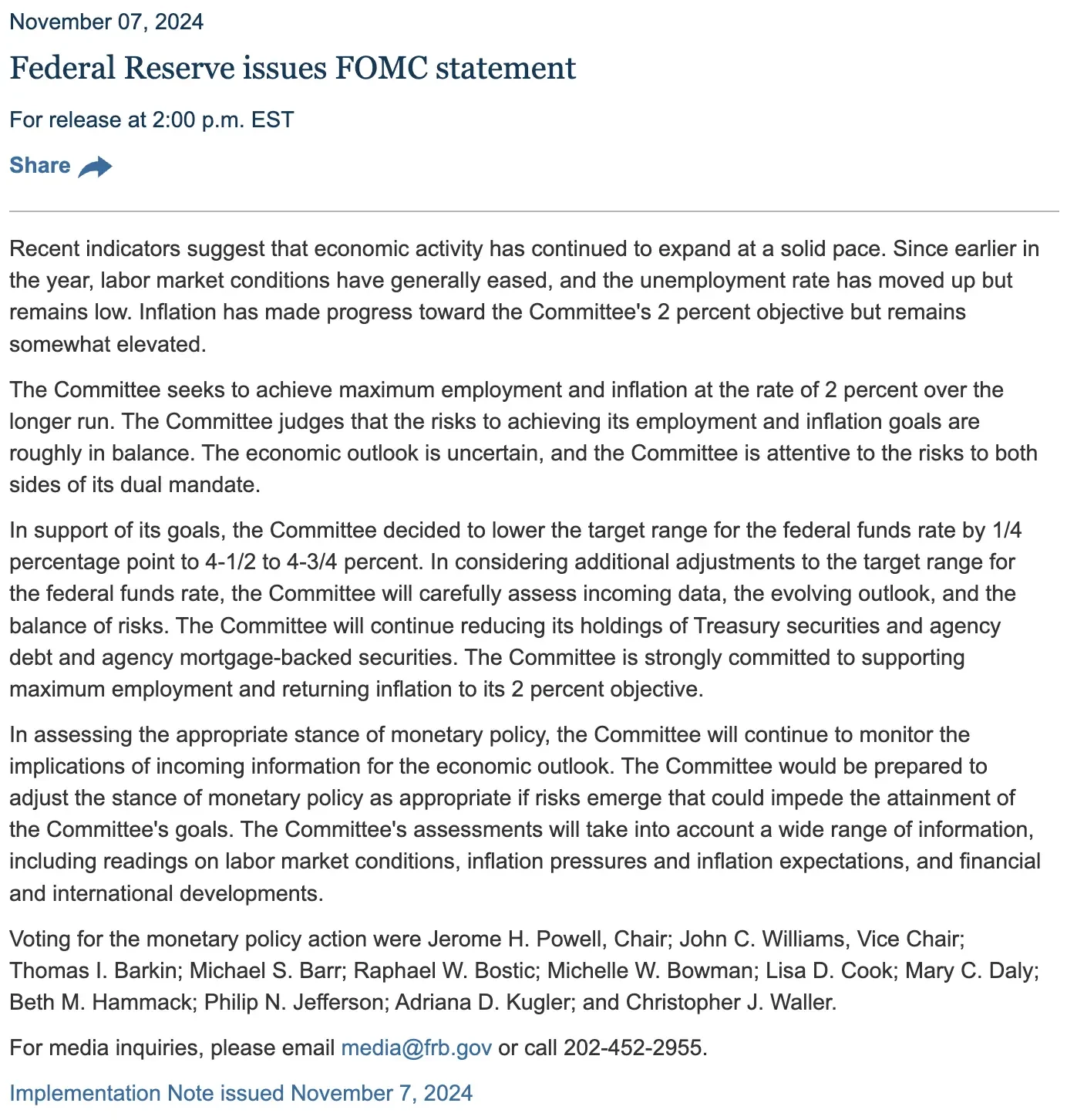 为了支持其目标,委员会决定将联邦基金利率的目标区间下调 25 个基点至 4.5% 至 4.75% 。在考虑对联邦基金利率目标区间的进一步调整时,委员会将仔细评估新数据、经济前景的变化以及风险的平衡。委员会还将继续减少其持有的国债、机构债务和机构抵押贷款支持证券的规模。委员会坚定致力于支持最大化就业并将通胀恢复至 2% 的目标。