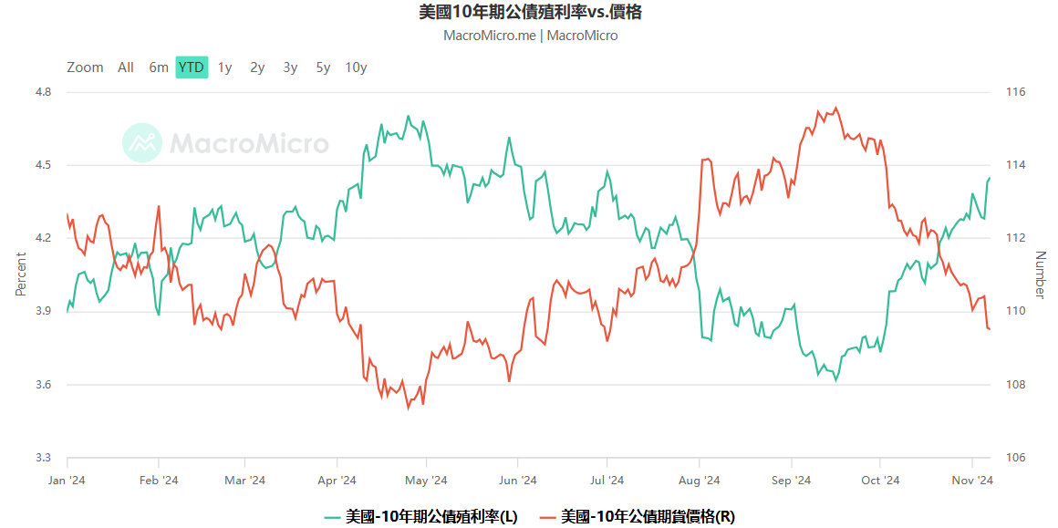 而在作为传统避险资产的美债价格,侭管联準会(Fed)已𫔭啟新一轮货币宽鬆周期,但随著川普宣布获胜,预期可能会让通膨复燃的背景下,美国 10 年期公债殖利率在 6 日升至 4.43%。(目前微幅下滑至 4.34%)