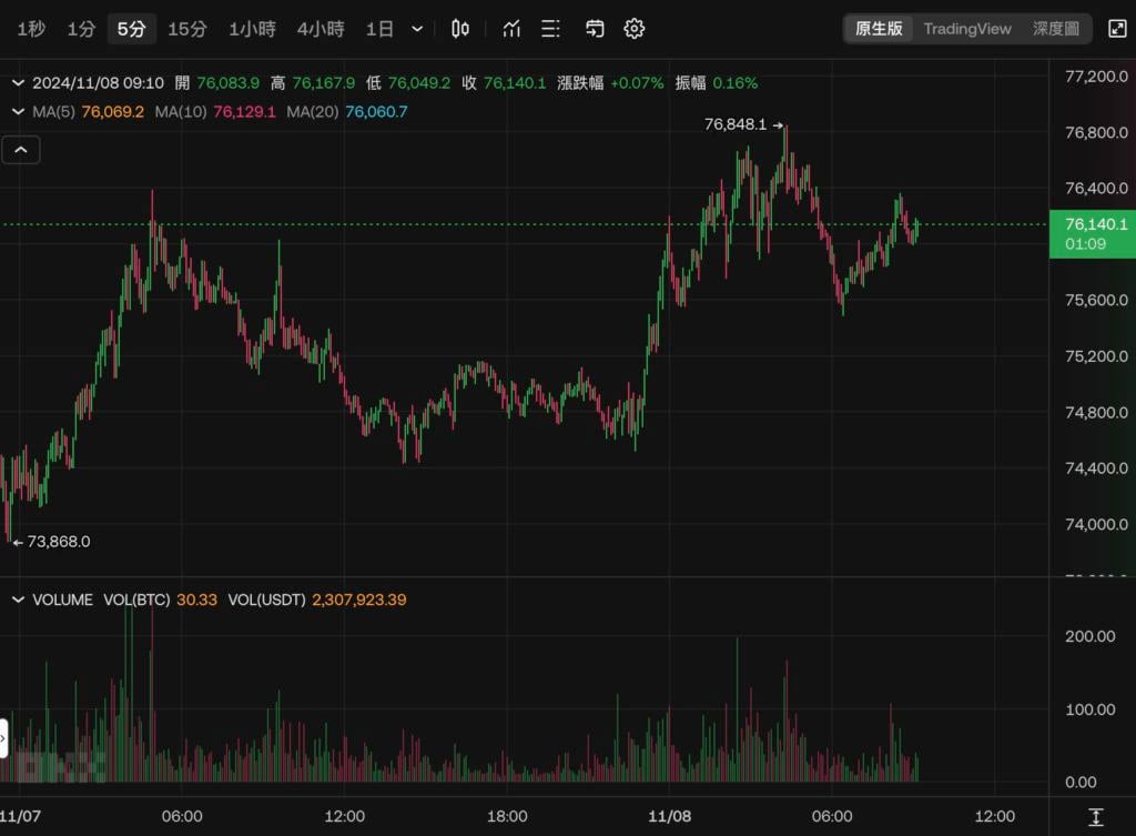 截稿前略有回落来到 76,000 美元水平,近 24 小时上涨幅度缩小到 1.08 %。